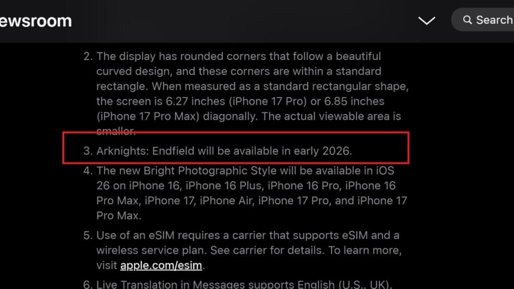 Hypergryph memang belum angkat bicara, namun sinyal tersebut meluncur dari informasi tambahan yang dilepas oleh Apple di sesi Newsroom mereka. Seperti yang kita tahu, untuk memperlihatkan kemampuan gaming yang bisa ditawarkan produk terbaru mereka – iPhone 17, Apple memilih Arknights: Endfield sebagai salah satu game yang dipamerkan.