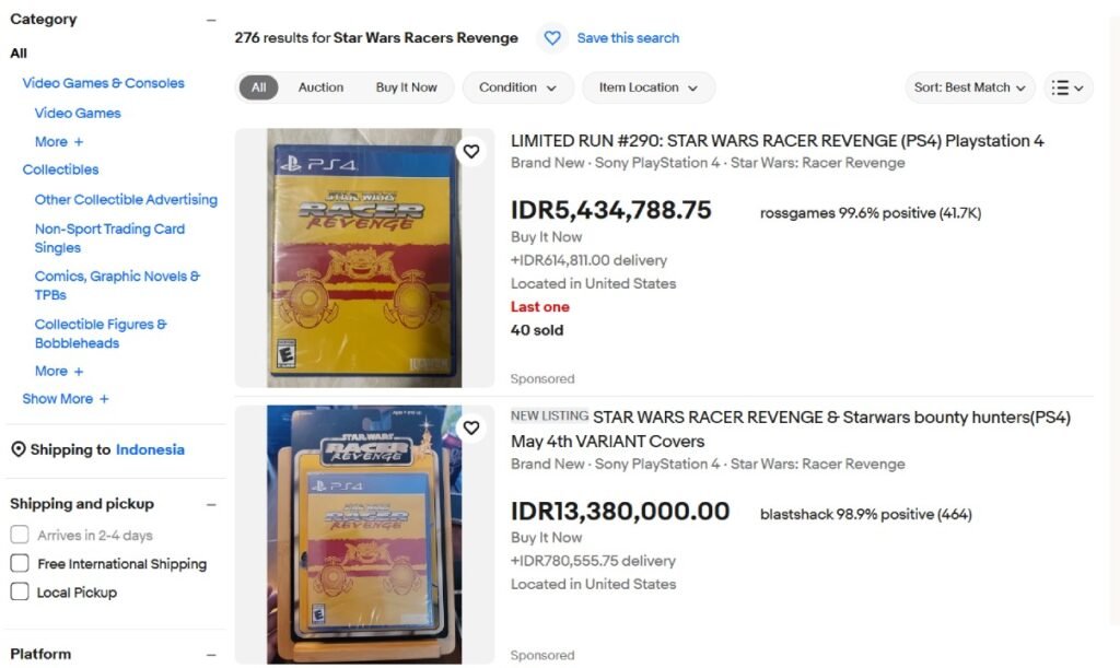 Situasi ini langsung membuat game Star Wars Racer Revenge PS4 versi fisik langsung meroket di ragam situs commerce. Untuk situs e-bay misalnya, game ini dijual di harga 5 jutaaan – 13 jutaan Rupiah.