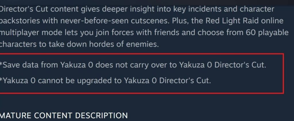 Ini berarti gamer-gamer yang tertarik untuk menikmatinya harus membeli ulang keseluruhan produk Yakuza 0: Director’s Cut ini. Tidak cukup sampai di sana, lewat informasi yang mereka bagikan di versi Steam, save data Yakuza 0 yang sudah Anda milliki juga tidak akan bisa digunakan dan diteruskan di versi Director’s Cut ini.