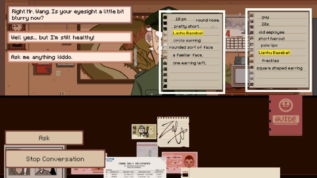 Bermodalkan sebuah kertas catatan kecil, proses interogasi Anda pada tiap saksi akan membuka rangkaian kata kunci yang nantinya harus Anda pindahkan ke notes kecil tersebut. Inti sesi yang satu ini sederhana – mengumpulkan sebanyak mungkin kata kunci dari setiap saksi untuk saling dibenturkan satu sama lain jika ia memang berujung bertentangan. Hasil akhirnya adalah sebuah clue yang lebih definitif soal informasi yang Anda butuhkan untuk mampu menebak siapa kira-kira si pelaku utama. Anda juga akan mendapatkan rangkaian bukti-bukti selama proses ini.