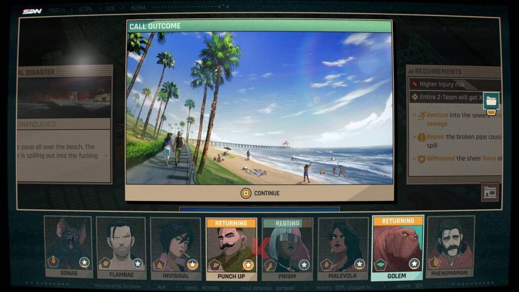Sebagai contoh? Prism akan menggandakan anggota tim yang ditempatkan di sisi kirinya tiap misi atau bagaimana Golem nantinya bisa mengisi kekosongan kebutuhan anggota tim di dalam kompisisi misi yang membutuhkan lebih dari 1 superhero dengan “klon” dirinya sendiri jika dibutuhkan. Atau sesederhana bagaimana Invisigal bergerak lebih cepat saat menyelesaikan misi sendiri atau bagaimana Sonar misalnya harus bergonta-ganti wujud dari kelelawar humanoid ke monster tiap misi yang masing-masing punya stats berbeda. Memanfaatkan fungsi-fungsi ini akan esensial bagi Anda sebagai seorang Dispatcher untuk mengatasi beragam masalah Los Angeles dengan lebih efisien.
