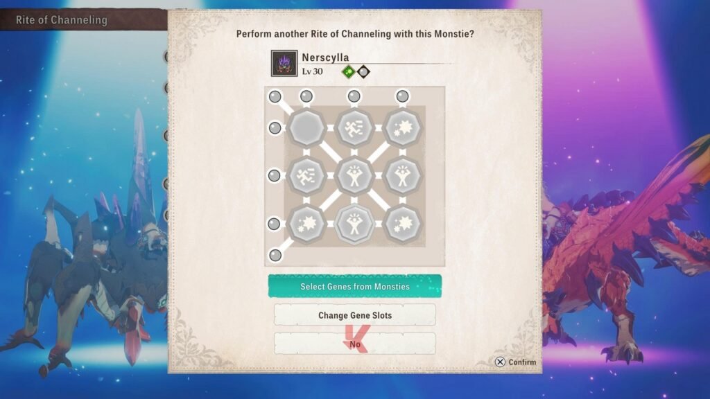 Tidak sampai di sana saja, Monster Hunter Stories 3 juga memungkinkan Anda untuk memperkuat monster-monster andalan Anda lewat sebuah mekanik bernama Rite of Channeling. Konsepnya sederhana dan mudah dipahami. Dengan menggunakan board berisikan 9 nodes, Anda bisa memasangkan skill aktif dan buff dari monster lain ke monster Anda sesuai dengan yang Anda inginkan untuk membuat mereka lebih mematikan. Game juga akan memberikan bonus tertentu jika lewat papan 3×3 ini, Anda berhasil meracik bingo Anda baik dari kesamaan warna ataupun logo.