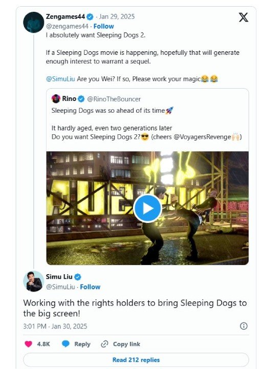 Simu Liu secara terbuka mengaku bahwa dirinya saat ini tengah bernegosiasi dengan para pemilik hak adaptasi Sleeping Dogs untuk benar-benar membawanya ke layar lebar. Walaupun tak memberikan lebih banyak detail, namun spekulasi meyakini bahwa jika lolos, ia yang akan memerankan sang tokoh utama – Wei Shen nantinya.