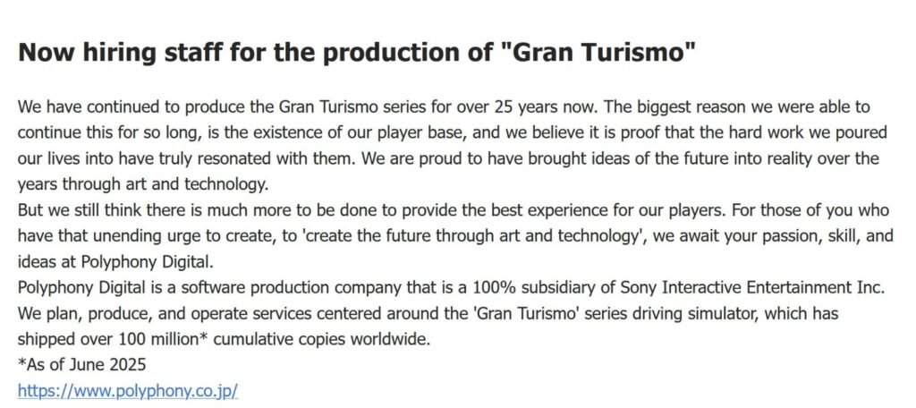 Lowongan untuk sekitar 18 posisi kosong tersebut dibuka dengan sambutan tertulis langsung dari sang boss besar – Kazunori Yamauchi. Terlepas dari usia franchise yang sudah menyentuh angka 25 tahun, Yamauchi merasa bahwa masih ada banyak hal yang bisa ditawarkan di masa depan untuk meraik pengalaman balap simulasi terbaik untuk player-player mereka.