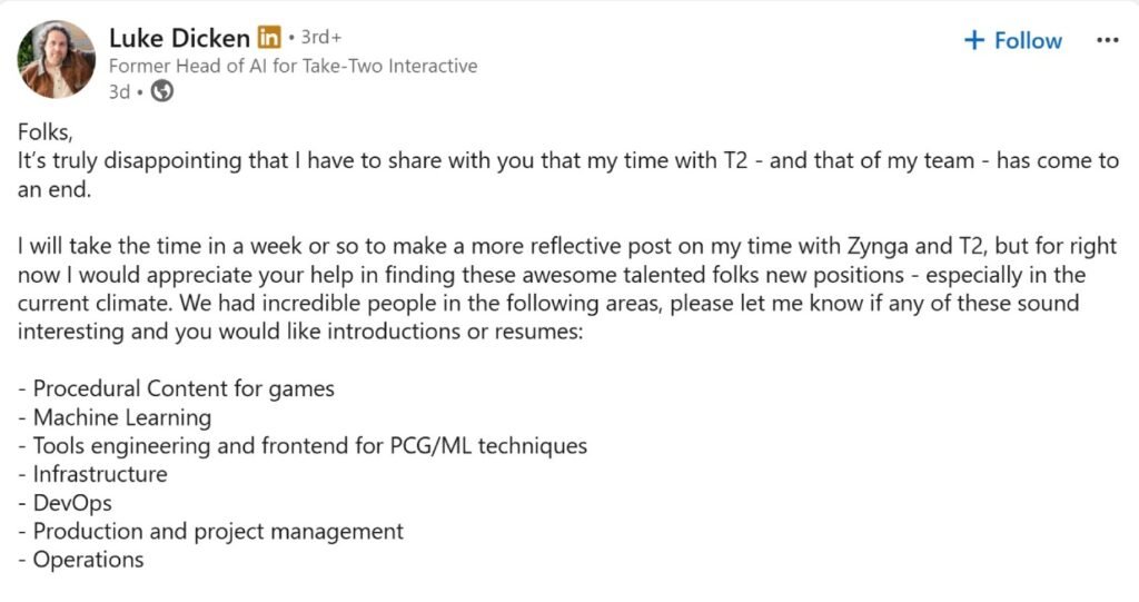 Informasi ini yang satu mengemuka lewat post kepala dari tim AI mereka sebelumnya – Luke Dicken lewat post yang ia lepas via LinkedIn. Dicken mengindikasikan bahwa keseluruhan tim AI yang sempat ia pimpin kini tidak lagi eksis walaupun tidak memberi banyak informasi soal berapa banyak orang yang terdampak.